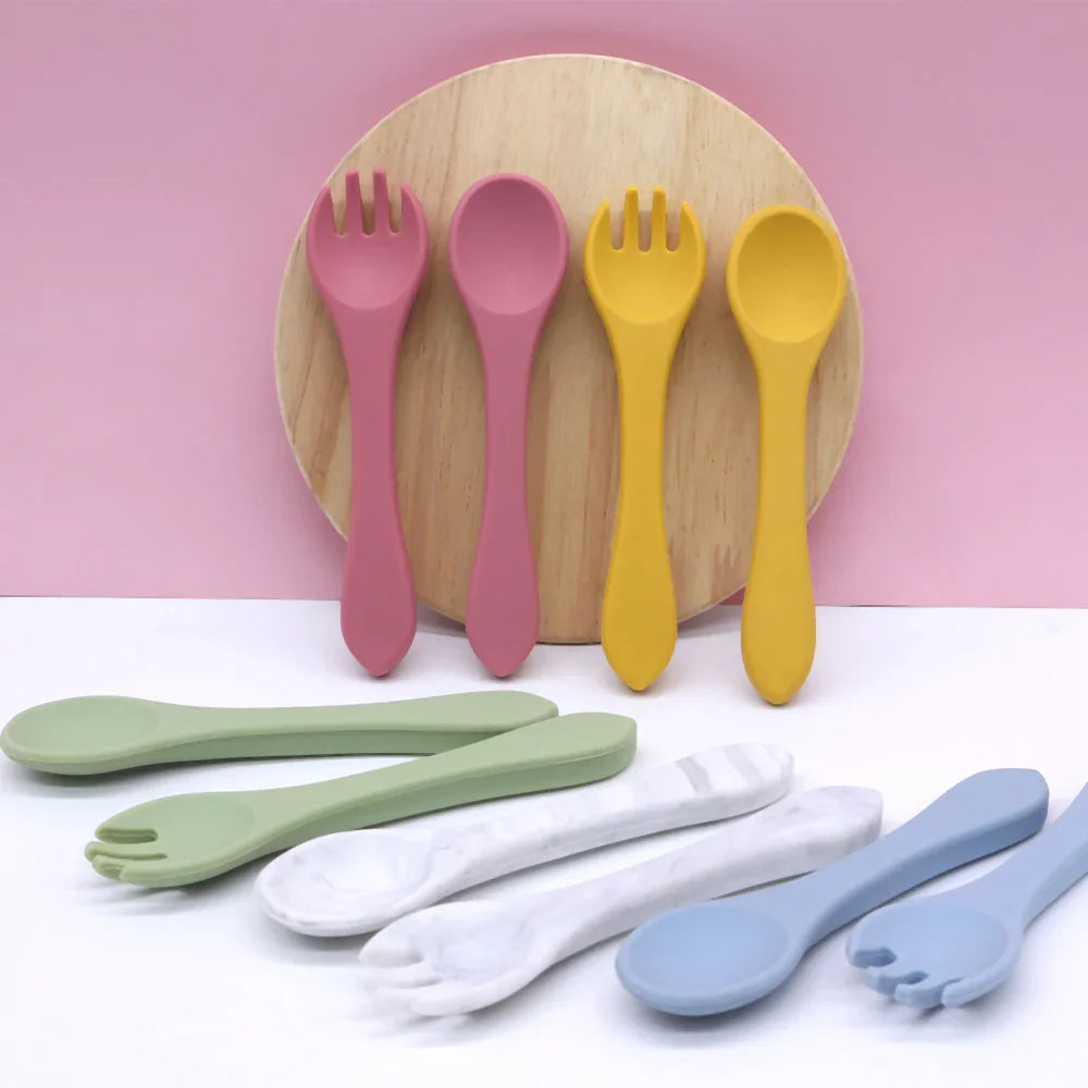 Este set de cubiertos es ideal para acompañar a tu bebé en la alimentación complementaria. Incluye una cuchara y un tenedor de silicona suaves, diseñados para proteger encías y primeros dientes, mientras fomentan que tu pequeño/a aprenda a comer de manera independiente.